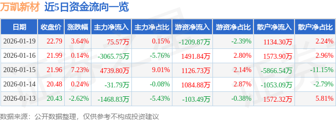 证券之星消息,截至2026年1月19日收盘,万凯新材(301216)报收于22.79元,上涨3.64%,换手率4.1%,成交量22.5万手,成交额5.06亿元。