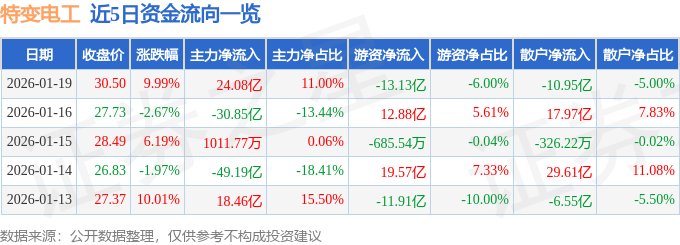 证券之星消息,截至2026年1月19日收盘,特变电工(600089)报收于30.5元,上涨9.99%,涨停,换手率14.71%,成交量743.04万手,成交额218.78亿元。