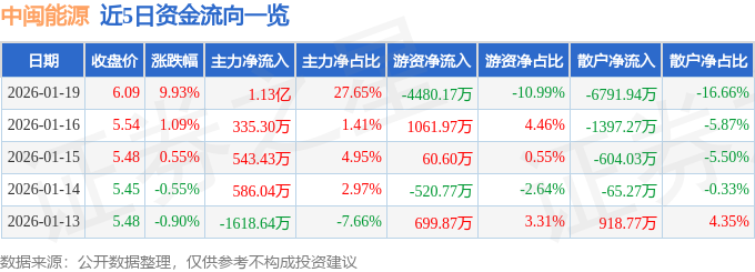 证券之星消息,截至2026年1月19日收盘,中闽能源(600163)报收于6.09元,上涨9.93%,涨停,换手率3.62%,成交量68.79万手,成交额4.08亿元。