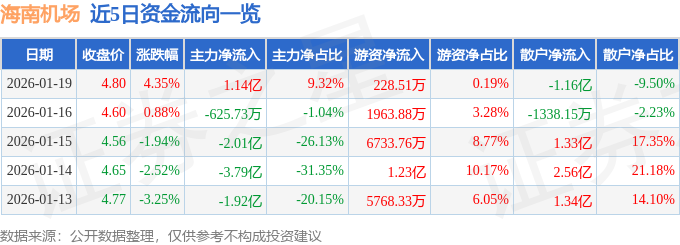 证券之星消息,截至2026年1月19日收盘,海南机场(600515)报收于4.8元,上涨4.35%,换手率2.81%,成交量258.22万手,成交额12.23亿元。