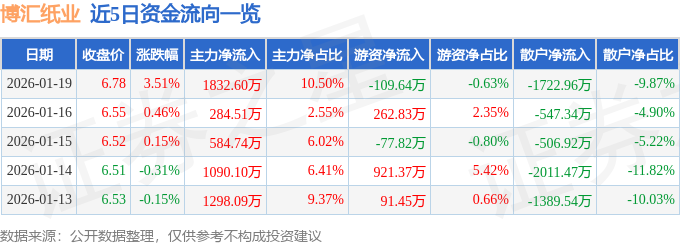 证券之星消息,截至2026年1月19日收盘,博汇纸业(600966)报收于6.78元,上涨3.51%,换手率1.95%,成交量26.02万手,成交额1.75亿元。
