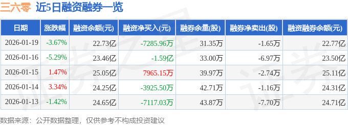 三六零融资融券信息显示,融资方面,当日融资买入2.68亿元,融资偿还3.4亿元,融资净偿还7285.96万元。融券方面,融券卖出1.09万股,融券偿还2.74万股,融券余量31.35万股,融券余额394.7万元。融资融券余额22.77亿元。