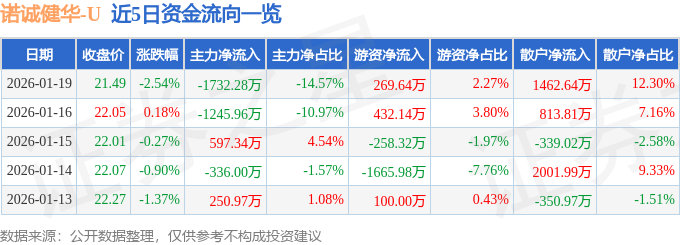 证券之星消息,截至2026年1月19日收盘,诺诚健华(688428)报收于21.49元,下跌2.54%,换手率2.05%,成交量5.51万手,成交额1.19亿元。
