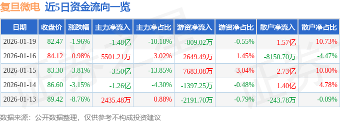证券之星消息,截至2026年1月19日收盘,复旦微电(688385)报收于82.47元,下跌1.96%,换手率3.25%,成交量17.54万手,成交额14.58亿元。