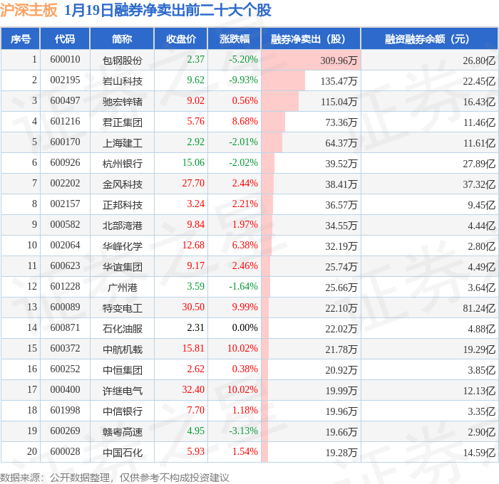 沪深主板融券净卖出前三分别为:包钢股份(600010)融券净卖出309.96万股、岩山科技(002195)融券净卖出135.47万股、驰宏锌锗(600497)融券净卖出115.04万股,前20具体见下表: