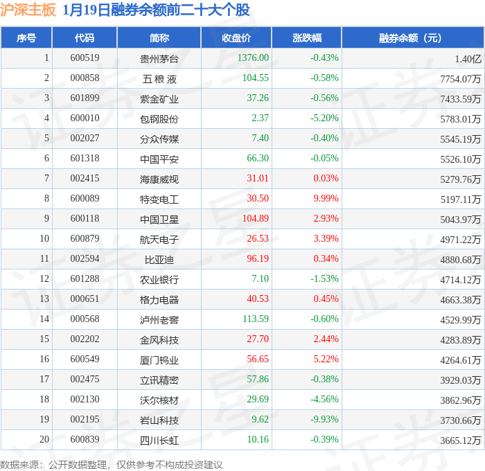 沪深主板融券余额前三分别为:贵州茅台(600519)融券余额1.4亿元、五 粮 液(000858)融券余额7754.07万元、紫金矿业(601899)融券余额7433.59万元,前20具体见下表: