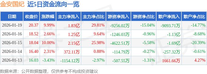 证券之星消息,截至2026年1月19日收盘,金安国纪(002636)报收于20.37元,上涨9.99%,涨停,换手率4.23%,成交量30.63万手,成交额6.16亿元。
