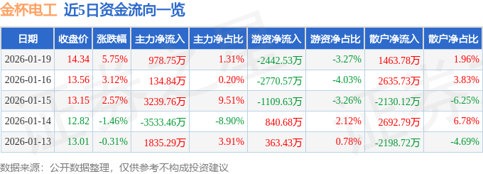 证券之星消息,截至2026年1月19日收盘,金杯电工(002533)报收于14.34元,上涨5.75%,换手率8.32%,成交量53.03万手,成交额7.47亿元。