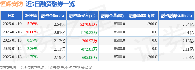 恒辉安防融资融券信息显示,融资方面,当日融资买入1.36亿元,融资偿还8326.36万元,融资净买入5270.81万元。融券方面,融券卖出0.0股,融券偿还200.0股,融券余量8300.0股,融券余额43.55万元。融资融券余额2.54亿元。