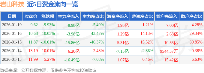 证券之星消息,截至2026年1月19日收盘,岩山科技(002195)报收于9.62元,下跌9.93%,换手率29.87%,成交量1672.98万手,成交额163.45亿元。