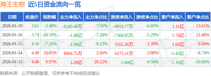 证券之星消息,截至2026年1月19日收盘,海王生物(000078)报收于3.61元,下跌3.48%,换手率8.53%,成交量224.04万手,成交额8.13亿元。