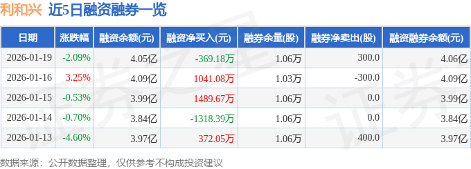 利和兴融资融券信息显示,融资方面,当日融资买入4447.68万元,融资偿还4816.87万元,融资净偿还369.18万元。融券方面,融券卖出300.0股,融券偿还0.0股,融券余量1.06万股,融券余额30.29万元。融资融券余额4.06亿元。