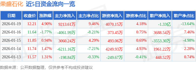 证券之星消息,截至2026年1月19日收盘,荣盛石化(002493)报收于12.21元,上涨4.9%,换手率0.86%,成交量80.87万手,成交额9.74亿元。