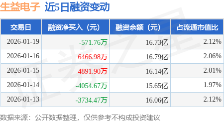 证券之星消息,1月19日,生益电子(688183)融资买入1.63亿元,融资偿还1.69亿元,融资净卖出571.76万元,融资余额16.73亿元,近20个交易日中有12个交易日出现融资净买入。