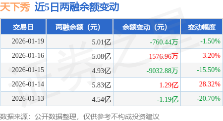 证券之星消息,1月19日,天下秀(600556)融资买入9458.34万元,融资偿还1.02亿元,融资净卖出752.48万元,融资余额4.98亿元,近20个交易日中有11个交易日出现融资净买入。