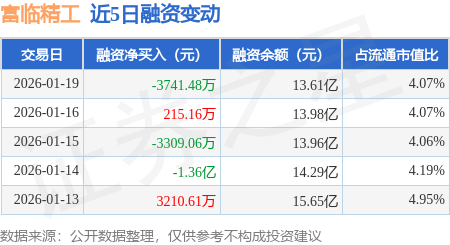 证券之星消息,1月19日,富临精工(300432)融资买入1.25亿元,融资偿还1.62亿元,融资净卖出3741.48万元,融资余额13.61亿元,近20个交易日中有12个交易日出现融资净买入。