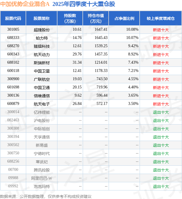 中加优势企业混合A的前十大重仓股如下: