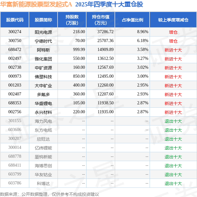 华富新能源股票型发起式A的前十大重仓股如下: