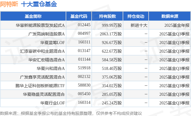重仓阿特斯的前十大公募基金请见下表: