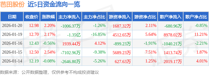 证券之星消息,截至2026年1月20日收盘,芭田股份(002170)报收于12.98元,上涨2.2%,换手率7.94%,成交量62.33万手,成交额7.99亿元。