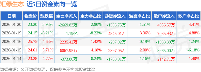 证券之星消息,截至2026年1月20日收盘,汇绿生态(001267)报收于23.2元,下跌3.93%,换手率6.51%,成交量39.45万手,成交额9.2亿元。