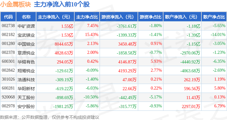 从资金流向上来看,当日小金属板块主力资金净流出26.55亿元,游资资金净流入10.21亿元,散户资金净流入16.33亿元。小金属板块个股资金流向见下表: