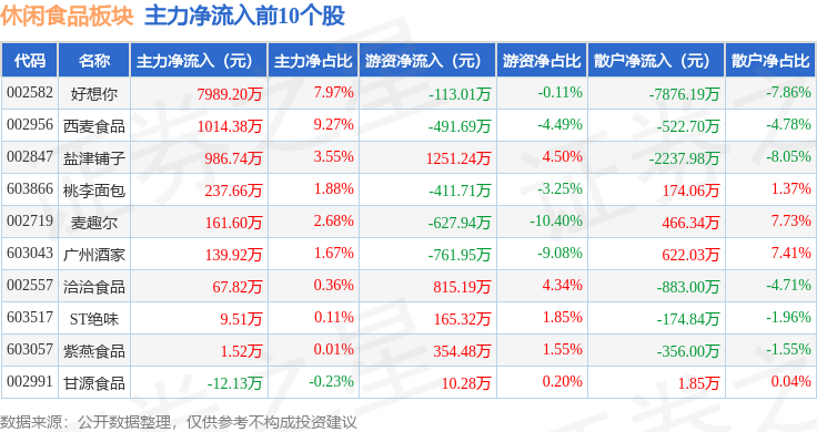 从资金流向上来看,当日休闲食品板块主力资金净流出6030.19万元,游资资金净流出1551.9万元,散户资金净流入7582.09万元。休闲食品板块个股资金流向见下表: