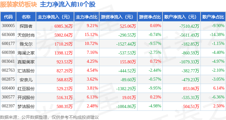 从资金流向上来看,当日服装家纺板块主力资金净流出1.31亿元,游资资金净流入8183.71万元,散户资金净流入4881.44万元。服装家纺板块个股资金流向见下表: