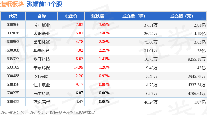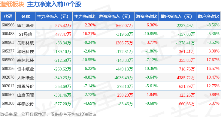 从资金流向上来看,当日造纸板块主力资金净流出3.82亿元,游资资金净流出1468.02万元,散户资金净流入3.96亿元。造纸板块个股资金流向见下表: