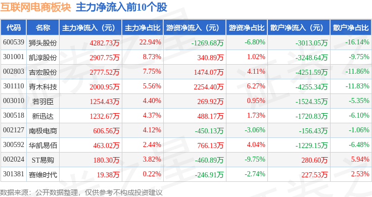 从资金流向上来看,当日互联网电商板块主力资金净流出2956.69万元,游资资金净流入1.0亿元,散户资金净流出7050.26万元。互联网电商板块个股资金流向见下表: