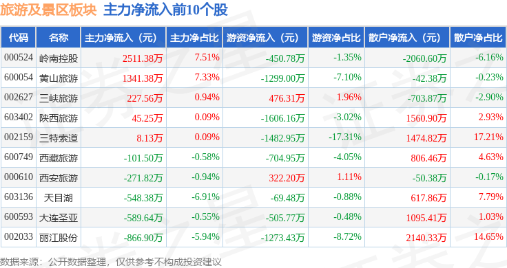 从资金流向上来看,当日旅游及景区板块主力资金净流出3.74亿元,游资资金净流出4826.55万元,散户资金净流入4.22亿元。旅游及景区板块个股资金流向见下表: