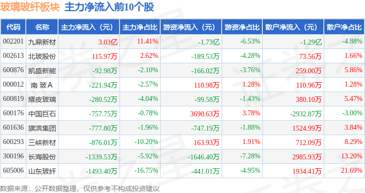 从资金流向上来看,当日玻璃玻纤板块主力资金净流出3.6亿元,游资资金净流出1.46亿元,散户资金净流入5.06亿元。玻璃玻纤板块个股资金流向见下表: