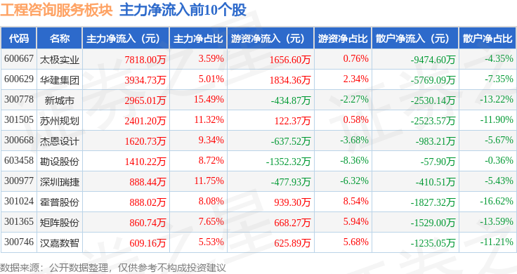 从资金流向上来看,当日工程咨询服务板块主力资金净流出1.05亿元,游资资金净流入1.14亿元,散户资金净流出954.57万元。工程咨询服务板块个股资金流向见下表: