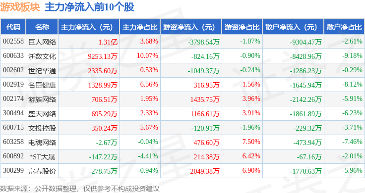 从资金流向上来看,当日游戏板块主力资金净流出7.41亿元,游资资金净流入2.85亿元,散户资金净流入4.57亿元。游戏板块个股资金流向见下表: