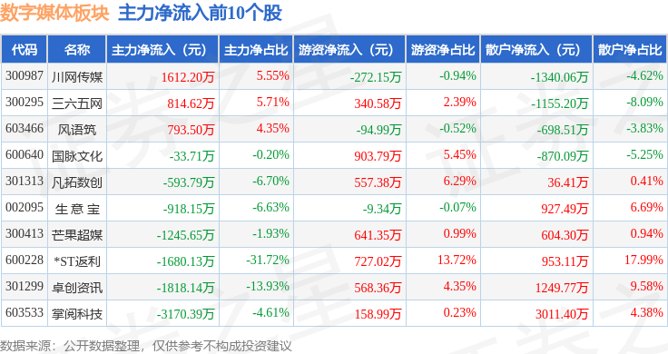 从资金流向上来看,当日数字媒体板块主力资金净流出9.14亿元,游资资金净流入5.72亿元,散户资金净流入3.43亿元。数字媒体板块个股资金流向见下表: