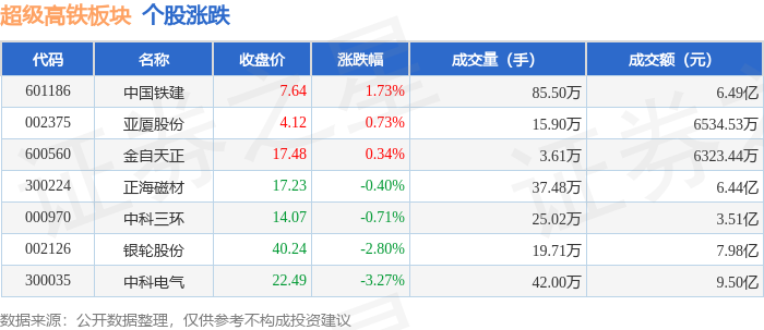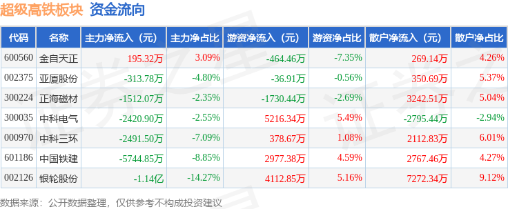 从资金流向上来看,当日超级高铁板块主力资金净流出2.37亿元,游资资金净流入1.05亿元,散户资金净流入1.32亿元。超级高铁板块个股资金流向见下表: