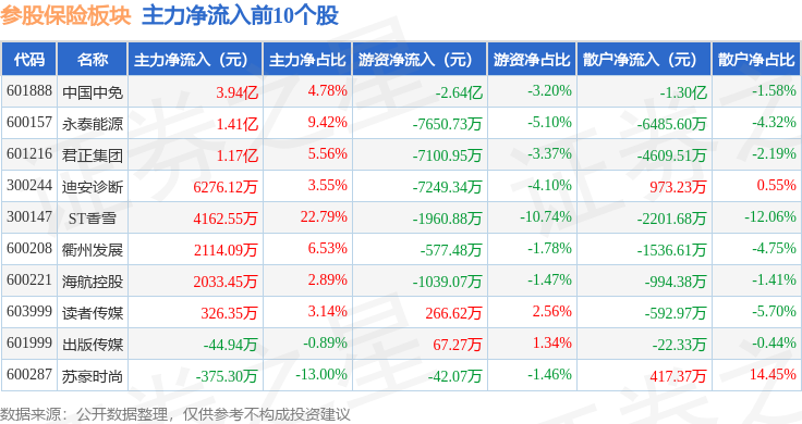 从资金流向上来看,当日参股保险板块主力资金净流出5.87亿元,游资资金净流出1.3亿元,散户资金净流入7.16亿元。参股保险板块个股资金流向见下表: