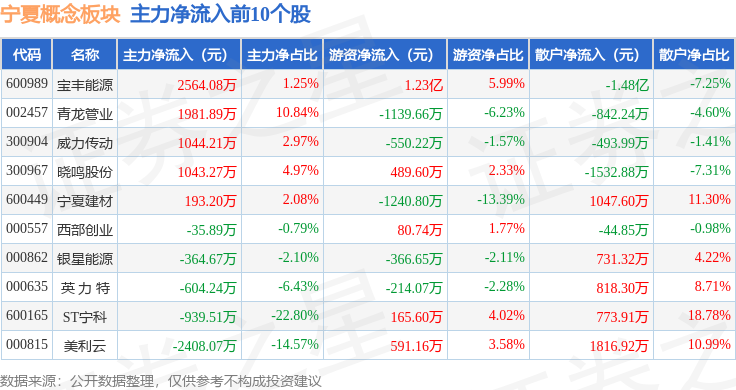 从资金流向上来看,当日宁夏概念板块主力资金净流出1.49亿元,游资资金净流入1.18亿元,散户资金净流入3150.46万元。宁夏概念板块个股资金流向见下表: