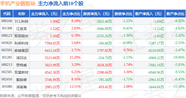 从资金流向上来看,当日手机产业链板块主力资金净流出112.99亿元,游资资金净流入21.62亿元,散户资金净流入91.37亿元。手机产业链板块个股资金流向见下表: