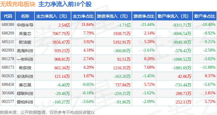 从资金流向上来看,当日无线充电板块主力资金净流出38.98亿元,游资资金净流入1.56亿元,散户资金净流入37.42亿元。无线充电板块个股资金流向见下表: