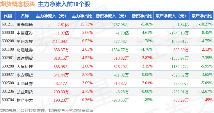 从资金流向上来看,当日期货概念板块主力资金净流入3308.95万元,游资资金净流出9152.81万元,散户资金净流入5843.87万元。期货概念板块个股资金流向见下表: