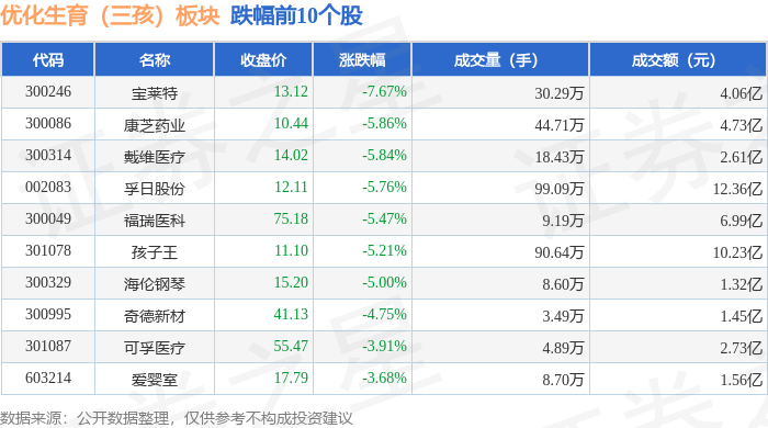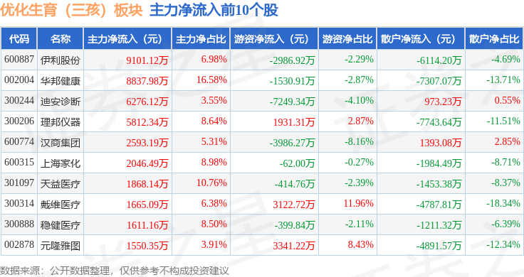 从资金流向上来看,当日优化生育(三孩)板块主力资金净流出12.41亿元,游资资金净流入5.0亿元,散户资金净流入7.4亿元。优化生育(三孩)板块个股资金流向见下表: