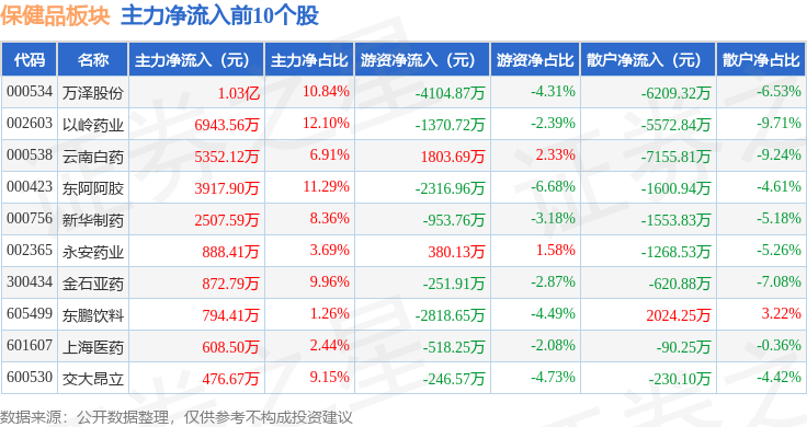 从资金流向上来看,当日保健品板块主力资金净流出5.03亿元,游资资金净流出581.78万元,散户资金净流入5.09亿元。保健品板块个股资金流向见下表: