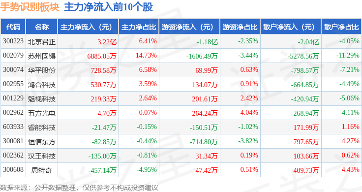 从资金流向上来看,当日手势识别板块主力资金净流出2.96亿元,游资资金净流入5789.02万元,散户资金净流入2.38亿元。手势识别板块个股资金流向见下表: