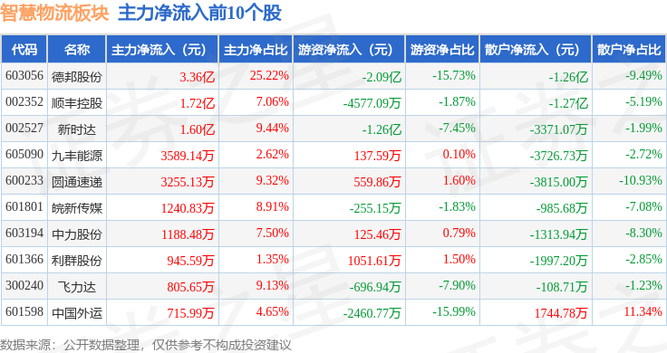 从资金流向上来看,当日智慧物流板块主力资金净流出8.57亿元,游资资金净流入6908.71万元,散户资金净流入7.88亿元。智慧物流板块个股资金流向见下表: