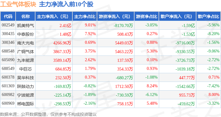 从资金流向上来看,当日工业气体板块主力资金净流出3.15亿元,游资资金净流入1.14亿元,散户资金净流入2.01亿元。工业气体板块个股资金流向见下表: