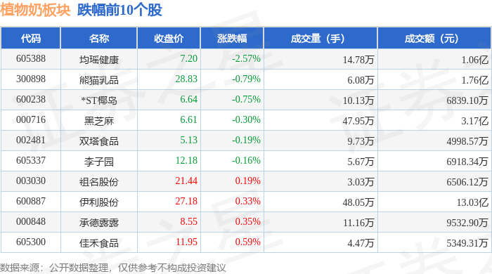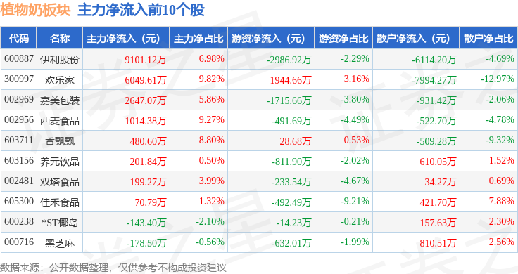 从资金流向上来看,当日植物奶板块主力资金净流入9441.85万元,游资资金净流出5218.93万元,散户资金净流出4222.92万元。植物奶板块个股资金流向见下表:
