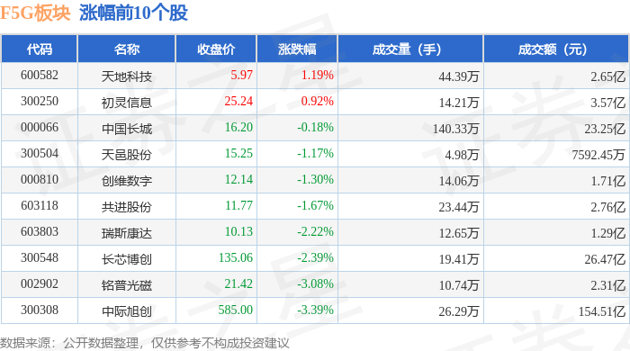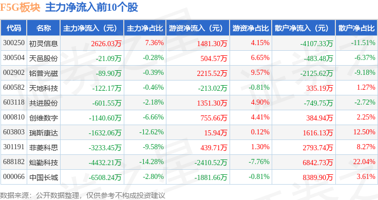 从资金流向上来看,当日F5G板块主力资金净流出36.51亿元,游资资金净流入25.22亿元,散户资金净流入11.29亿元。F5G板块个股资金流向见下表: