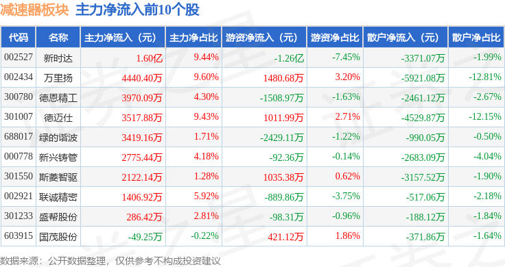 从资金流向上来看,当日减速器板块主力资金净流出15.63亿元,游资资金净流入4.5亿元,散户资金净流入11.13亿元。减速器板块个股资金流向见下表: