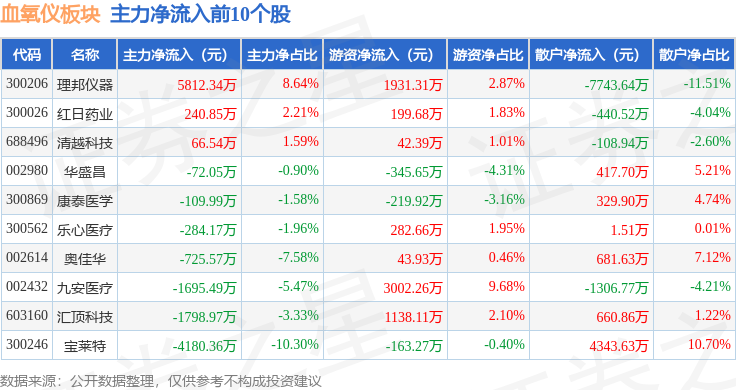 从资金流向上来看,当日血氧仪板块主力资金净流出2.57亿元,游资资金净流入4540.23万元,散户资金净流入2.12亿元。血氧仪板块个股资金流向见下表: